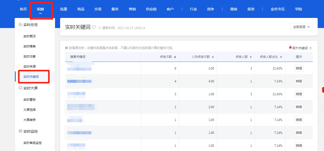 在商智中除了能找到行業(yè)熱搜詞之外,也可以看到自身的成交詞,路徑是商智-實(shí)時-實(shí)時關(guān)鍵詞,什么是實(shí)時關(guān)鍵詞呢?實(shí)時關(guān)鍵詞是基于實(shí)時點(diǎn)擊數(shù)據(jù)流,計算用戶搜索關(guān)鍵詞后點(diǎn)擊店鋪中商品和店鋪的數(shù)據(jù),包括點(diǎn)擊人數(shù)、點(diǎn)擊次數(shù)等指標(biāo)。對于每個關(guān)鍵詞,還可查看用戶通過搜索這個詞點(diǎn)擊了店鋪中的哪些商品。