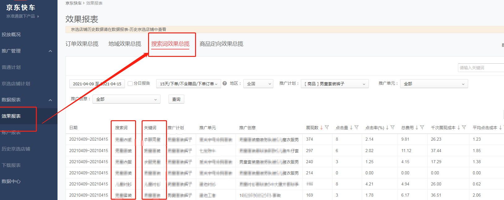 除了行業(yè)大盤里面的行業(yè)熱搜詞之外,對于已經(jīng)投放過快車和海投的商家來說,可以在效果報表里面看到搜索詞效果總覽。可以選擇最近七天的數(shù)據(jù),然后看七天內(nèi)數(shù)據(jù)最好的關(guān)鍵詞,從中找出有訂單的成交詞和展現(xiàn)點(diǎn)擊率高的引流詞加入的新計劃中進(jìn)行測試。這里要注意的是搜索詞效果總覽只會統(tǒng)計最近七天的數(shù)據(jù),商家們要養(yǎng)成開啟計劃之后每七天下載一次數(shù)據(jù)報表的好習(xí)慣喲。