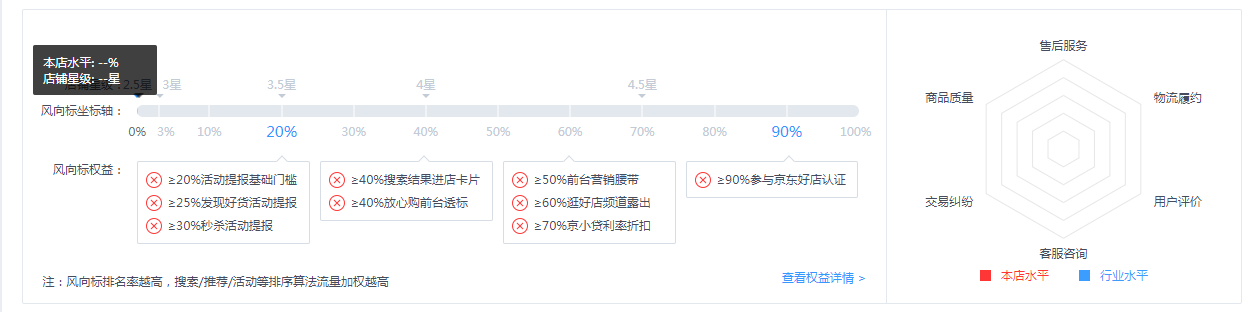 我們首先可以從店鋪星級和風向標的坐標軸可以看出,風向標在每個不同的分數比例上,會有不同的分數顯示以及會帶來不同好處和壞處。在上圖可以看出每個店鋪的風向標基礎是需要在20%以上,才能去提報一些活動.(所以在我們馬上到來的618大促,能不能進入到大促的門檻,各位同學可以去看下你夠資格參加嗎?)同樣的在店鋪排名率達到90%以上的話可以申請京東好店的認證,有了好店的認證對于店鋪的權重和流量都會有很好的增長。