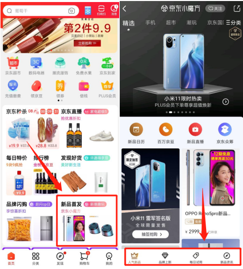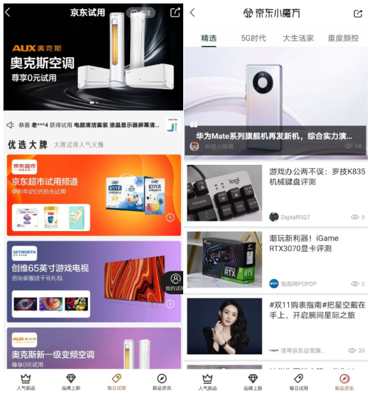 該頻道的入口都有:APP首頁核心頻道樓層、PC首頁樓層、微信購物首頁新品首發、微信京東購物小程序新品首發。這些都是點擊率和展現非常優秀的位置,能夠給投放商家帶來最大的收益。底部頻道包括人氣新品、品牌上新、每日試用、新品資訊四個板塊。人氣新品是頻道首頁,由資源位+feeds 流組成,主要展示上新單品,也是展示效果最好的位置,可以帶來大量轉化。品牌上新是以品牌店鋪為維度的上新集合頁,主要是以品牌和店鋪為維度展示系列的上新產品。每日試用板塊是試用頻道頁面,同時重點展示新品試用,便于上新期間品牌獲取用戶對于新品的反饋,同時幫忙頻道曝光新品,商家如果想做該板塊一定注意要挑選好試用產品。最后是新品資訊板塊,主要是配合新品做的各種評測視頻文章等的展示。