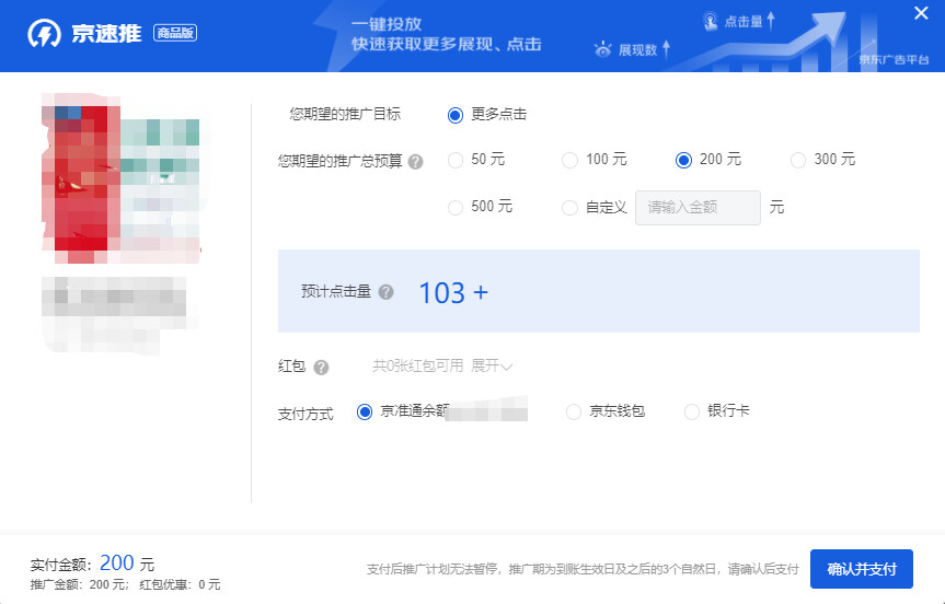 c、點擊商品推廣:進入投放頁面,廣告主可選擇推廣目標、推廣預算、紅包、支付方式創建推廣計劃,對SKU/SPU進行投放。其推廣目標:目前目標只有“更多點擊”,后續會增加其他轉化目標等。推廣周期:計劃生效時長是3天,創建之后不可修改、暫停。支付方式:建議選擇京準通余額,充值后可立即推廣。預計點擊量:根據歷史數據對本次推廣的目標以及推廣預算對可能獲得的點擊量進行預估。