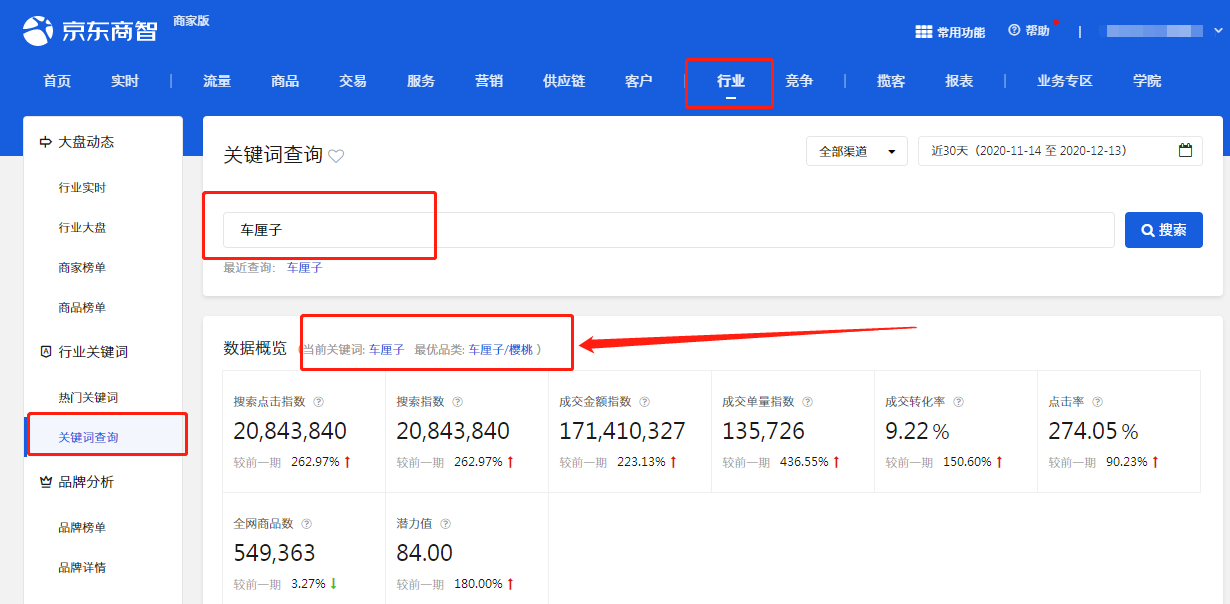 再者就是我們產品的類目一定不能選錯,否則你的產品不會予以任何的扶持,流量的質量也非常差。所以在我們上新之前,一定要弄清楚我們最優類目是什么。這里可以在京東平臺進行搜索我們準備上架的產品,看絕大部分產品是什么類目的,也可以在商智-行業-關鍵詞查詢中查詢得知。