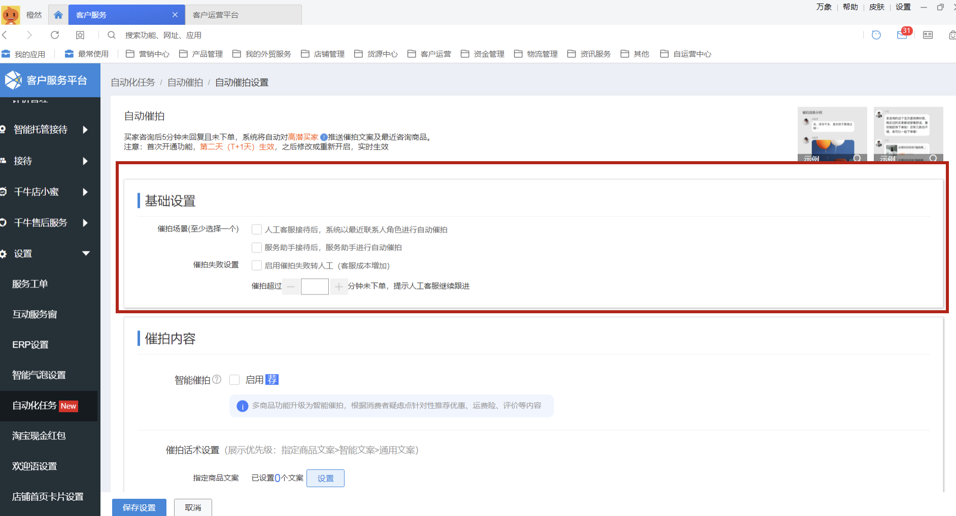 首次開啟點擊自動催拍卡片上的“開啟”按鈕,即可進(jìn)入設(shè)置頁面;路徑:客戶服務(wù)平臺-設(shè)置-自動化任務(wù)-自動催拍