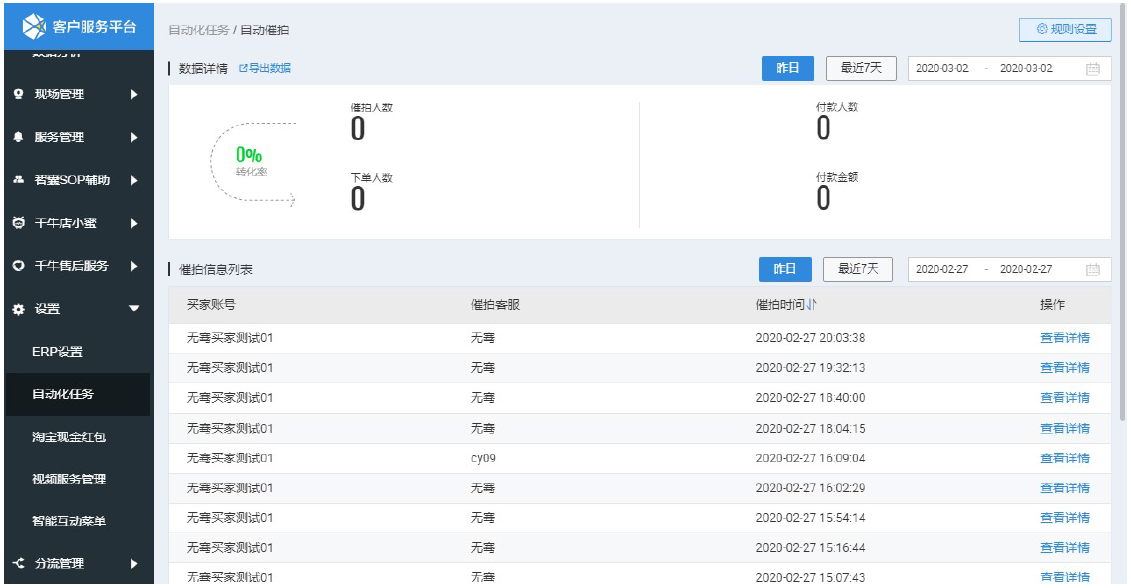 -開啟:打開千牛,進(jìn)入“客戶服務(wù)平臺”插件,點擊設(shè)置-自動化任務(wù),即可進(jìn)入自動化任務(wù)功能頁面;